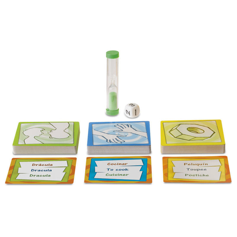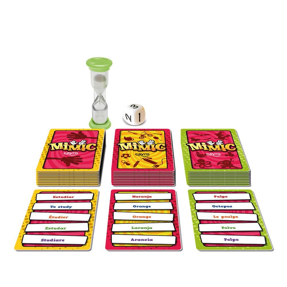 Recommended age: 8+ years. Number of players: 4+. Box size: 10.5 x 10.5 x 5.5 cm. Psychopedagogical aspects: Reasoning, Visuospatial skills, Imagination and creativity, Cooperation and leadership, Verbal expression and communication, Vocabulary. Mimic is a hilarious game of charades and sounds in which, taking turns, one player from each team must act out as many words as possible. The die indicates the number of words that must be acted out, guessed, and used to form a sentence within one minute. If there is time left, you can take a chance and roll the die again to get more cards. But be careful, because if you run out of time and not all the cards in play have been resolved, you will lose as many cards as the die indicates at that moment. The cards are divided into three categories: Actions, Objects, and Characters. How would you get them to guess Lady Gaga? Or a Drag Queen? Contains 105 pieces., 8422878770038